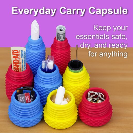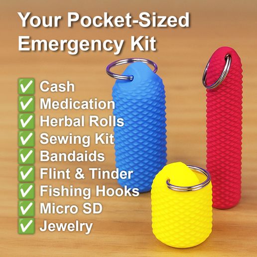 The Emergency Stash Keychain is a compact, durable capsule designed for everyday carry of essential items. These keychain containers come in various shapes and sizes, all featuring a secure, threaded lid to keep contents safe and dry. The exterior is textured with a diamond pattern, providing a secure grip even in wet or gloved hands. Each container is topped with a keyring loop for easy attachment to keys, backpacks, or lanyards. For preppers and survivalists, this keychain offers a discreet way to carry vital supplies. Use it to store emergency cash, water purification tablets, pain relievers, or even a small supply of tinder. The watertight seal can protect medications from moisture damage, and the durable construction ensures that your supplies are safe from impact damage. Depending on the printing material used (such as TPU or PETG), it can offer varying degrees of flexibility and impact resistance. Imagine being caught in an unexpected situation: having a dose of medication readily available, a rolled-up $20 bill for unexpected expenses, or waterproof matches to start a fire could be lifesavers. The Emergency Stash Keychain allows you to be prepared without adding bulk to your everyday carry. Consider printing these in various colors to color-code the contents for quick identification in a stressful situation.